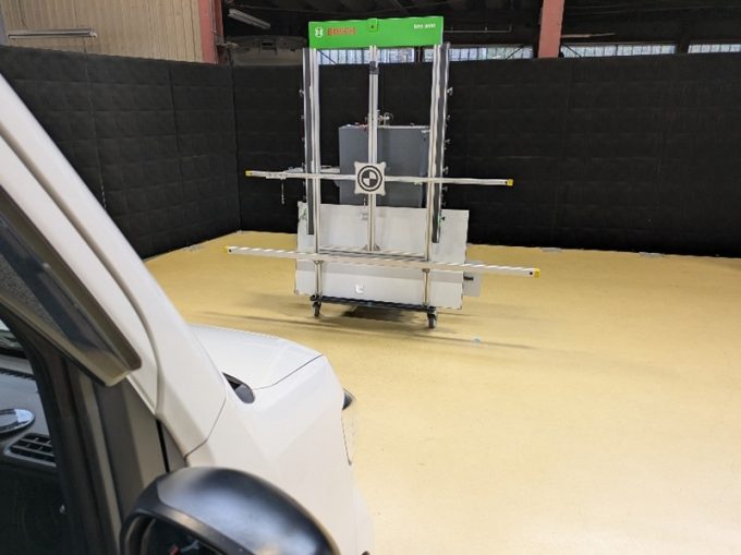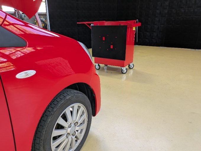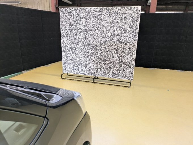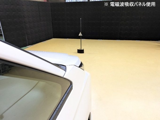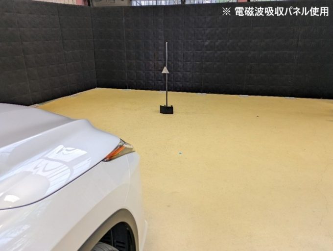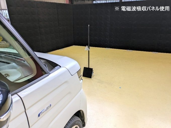 ※上記、「ミリ波レーダー」エーミングの際には反射物の無い空間が必要ですが、三角リフレクター後方の黒い壁に見える「電磁波吸収パネル」(ニフコ社製)を設置して不要な反射を防止し『検査空間』の確保を実施しています。
