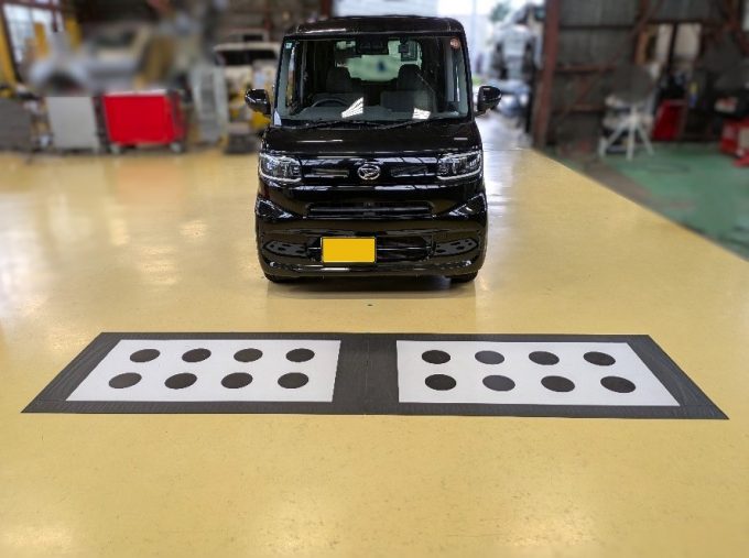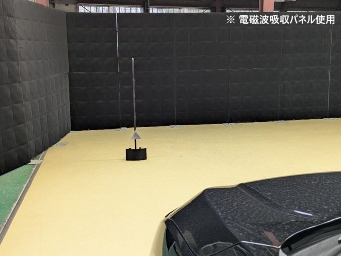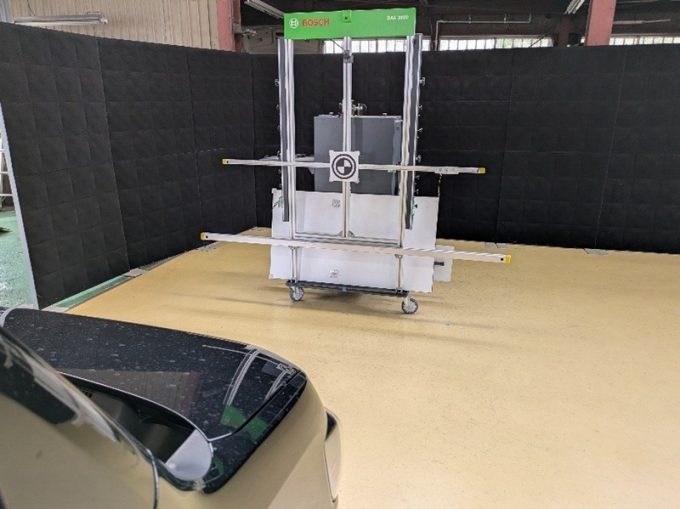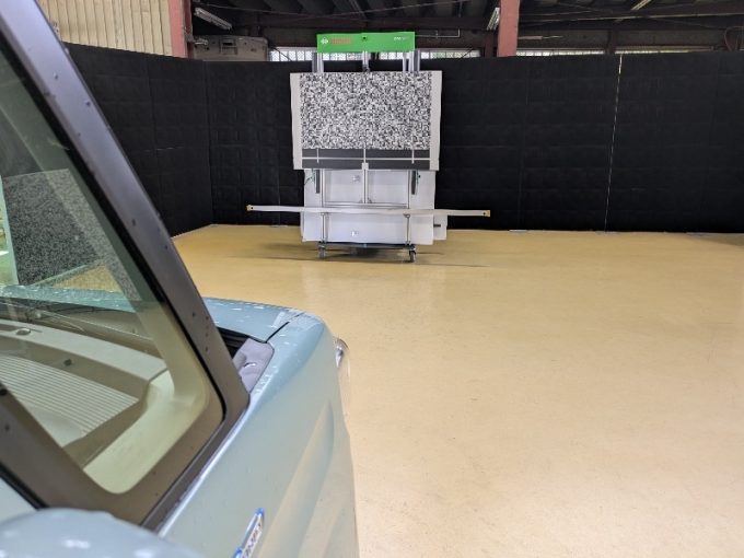 ※上記、「ミリ波レーダー」エーミングの際には反射物の無い空間が必要ですが、三角リフレクター後方の黒い壁に見える「電磁波吸収パネル」(ニフコ社製)を設置して不要な反射を防止し『検査空間』の確保を実施しています。