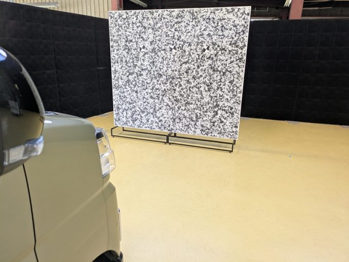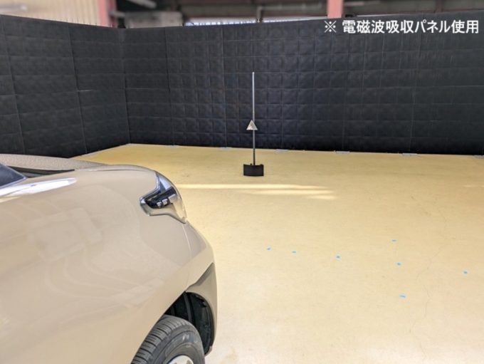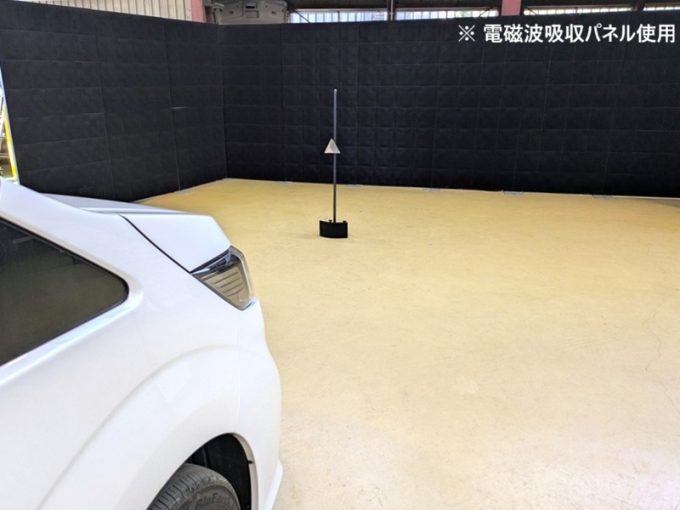 ※上記、「ミリ波レーダー」エーミングの際には反射物の無い空間が必要ですが、三角リフレクター後方の黒い壁に見える「電磁波吸収パネル」(ニフコ社製)を設置して不要な反射を防止し『検査空間』の確保を実施しています。