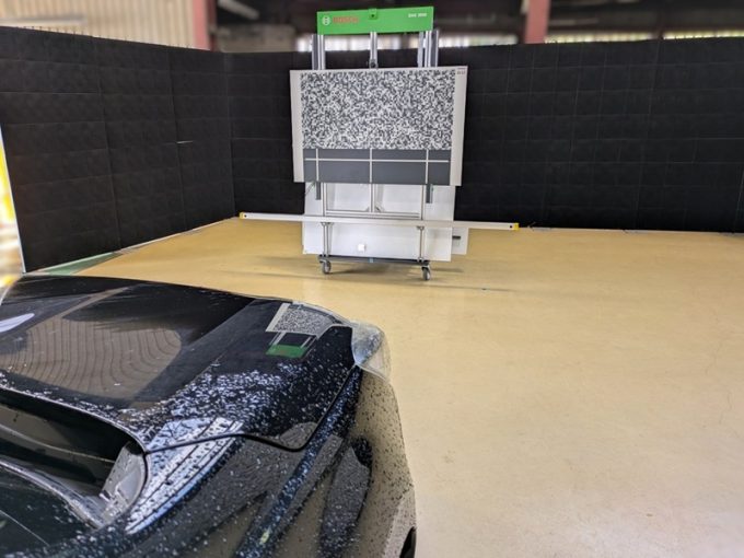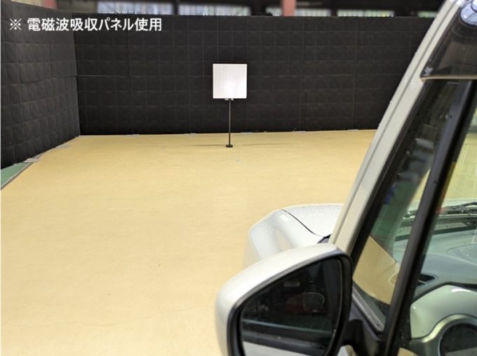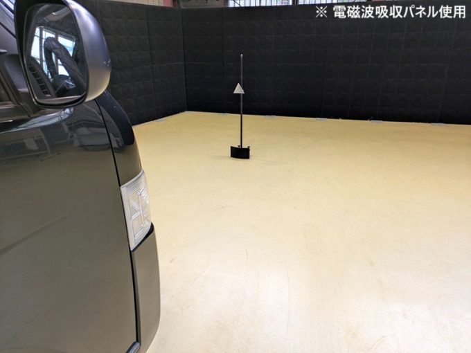 ※上記、「ミリ波レーダー」エーミングの際には反射物の無い空間が必要ですが、三角リフレクター後方の黒い壁に見える「電磁波吸収パネル」(ニフコ社製)を設置して不要な反射を防止し『検査空間』の確保を実施しています。