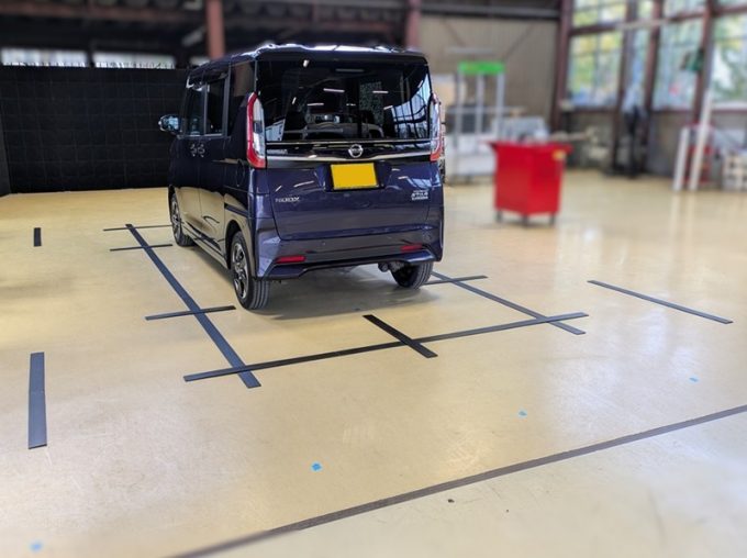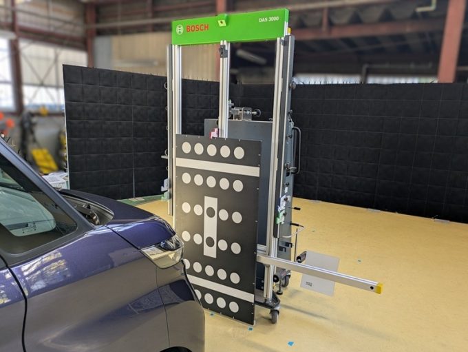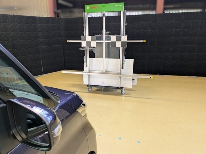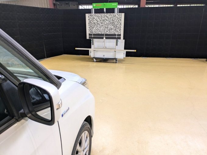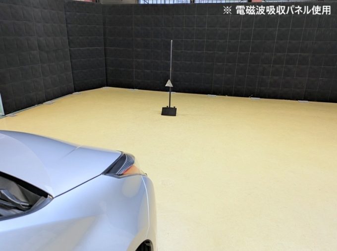 ※上記、「ミリ波レーダー」エーミングの際には反射物の無い空間が必要ですが、三角リフレクター後方の黒い壁に見える「電磁波吸収パネル」(ニフコ社製)を設置して不要な反射を防止し『検査空間』の確保を実施しています。
