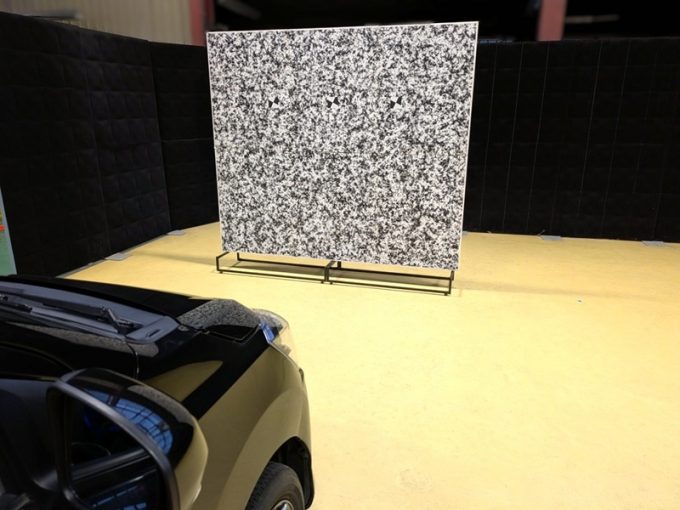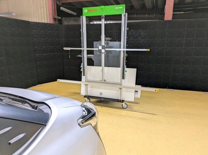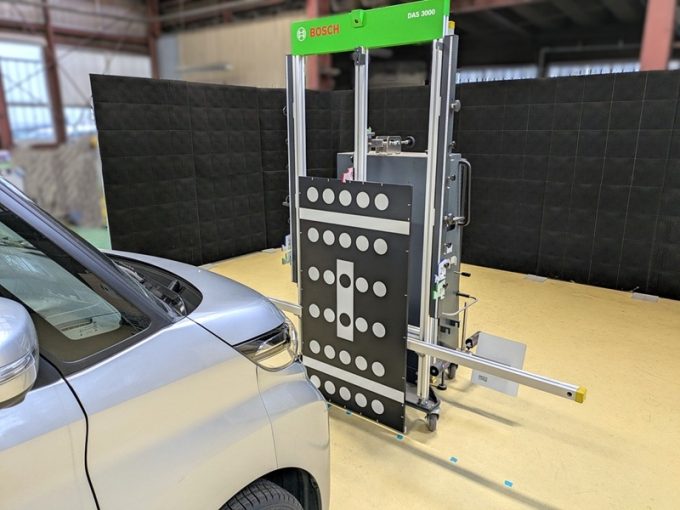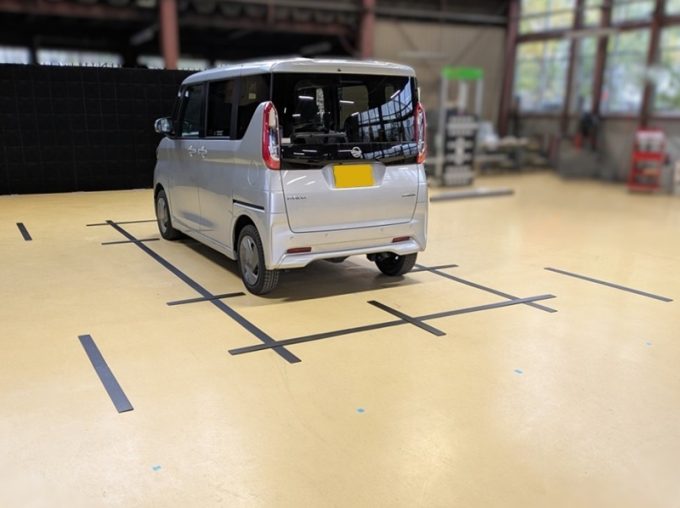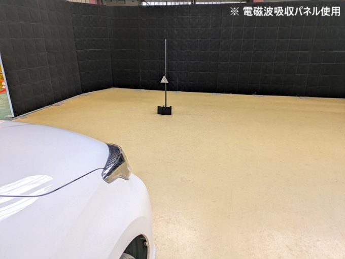※上記、「ミリ波レーダー」エーミングの際には反射物の無い空間が必要ですが、三角リフレクター後方の黒い壁に見える「電磁波吸収パネル」(ニフコ社製)を設置して不要な反射を防止し『検査空間』の確保を実施しています。