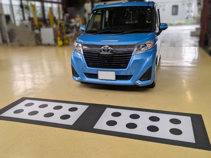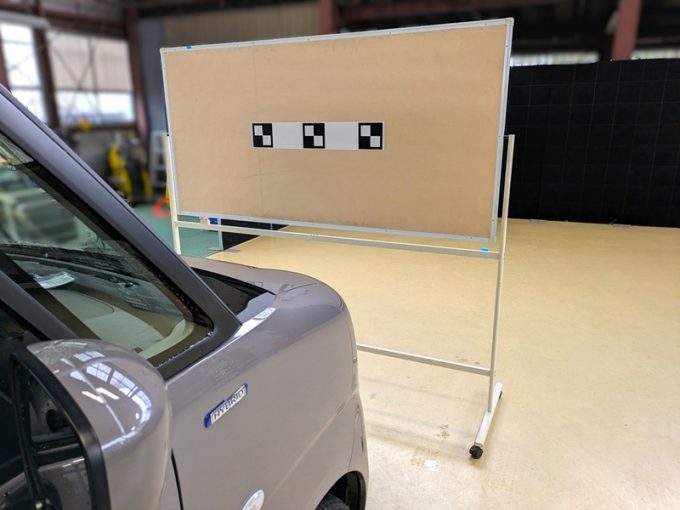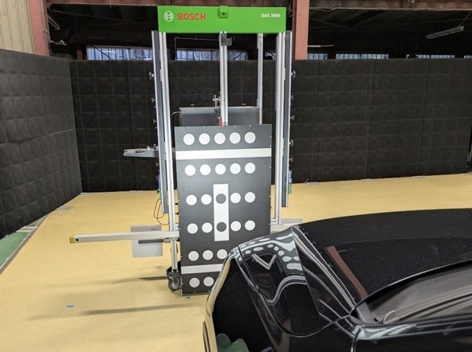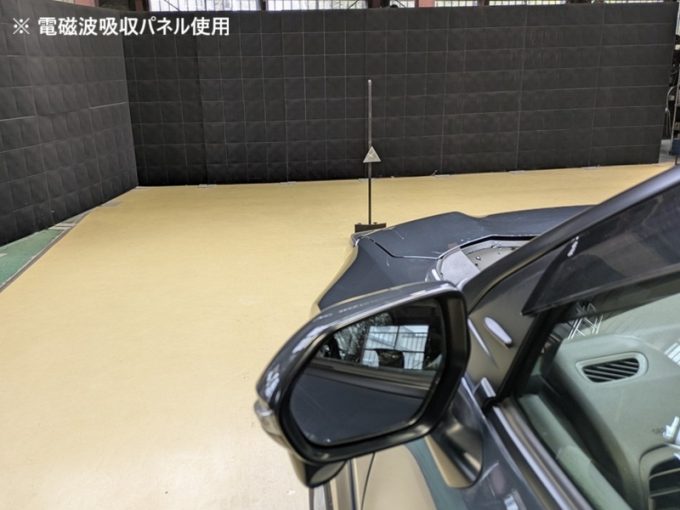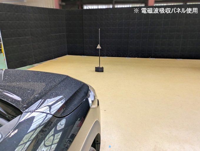 ※上記、「ミリ波レーダー」エーミングの際には反射物の無い空間が必要ですが、三角リフレクター後方の黒い壁に見える「電磁波吸収パネル」(ニフコ社製)を設置して不要な反射を防止し『検査空間』の確保を実施しています。