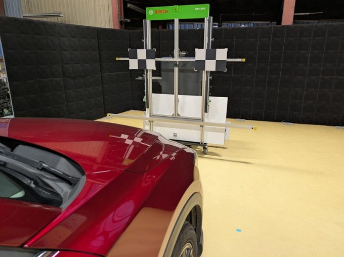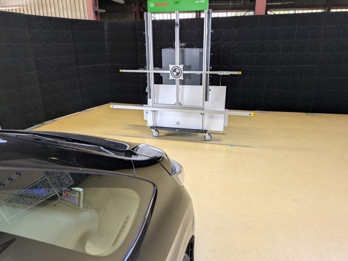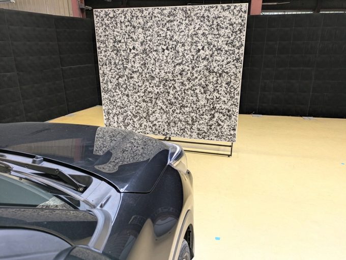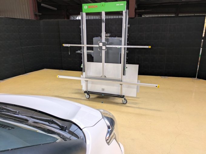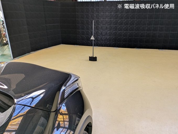 ※上記、「ミリ波レーダー」エーミングの際には反射物の無い空間が必要ですが、三角リフレクター後方の黒い壁に見える「電磁波吸収パネル」(ニフコ社製)を設置して不要な反射を防止し『検査空間』の確保を実施しています。