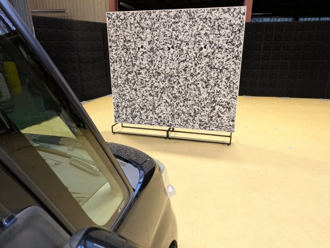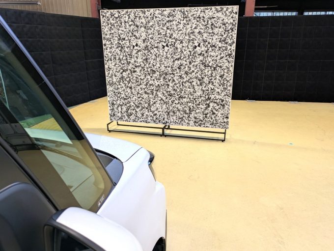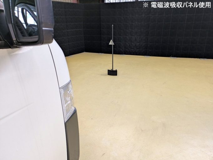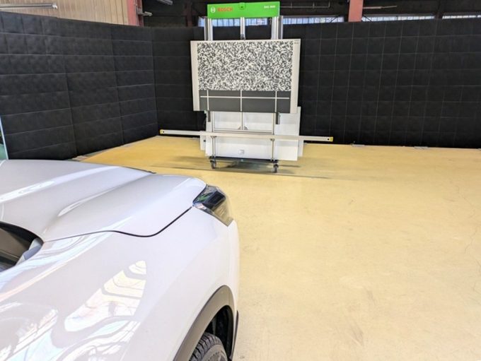 ※上記、「ミリ波レーダー」エーミングの際には反射物の無い空間が必要ですが、三角リフレクター後方の黒い壁に見える「電磁波吸収パネル」(ニフコ社製)を設置して不要な反射を防止し『検査空間』の確保を実施しています。