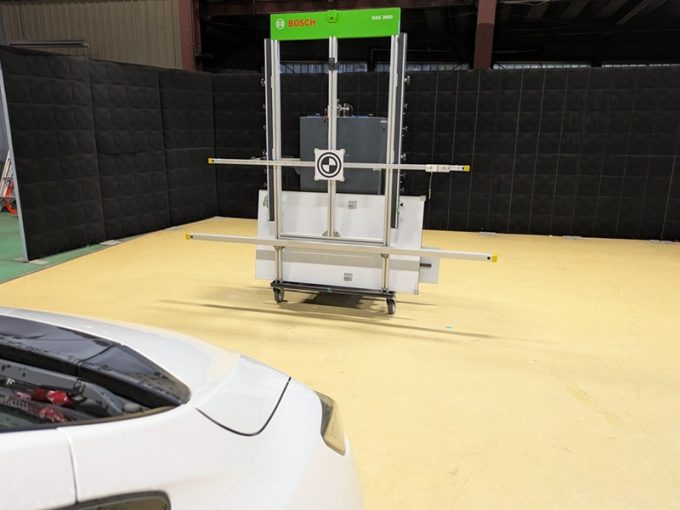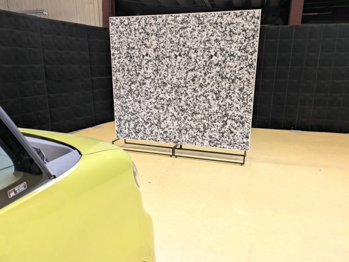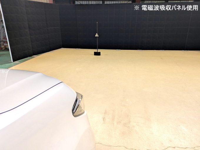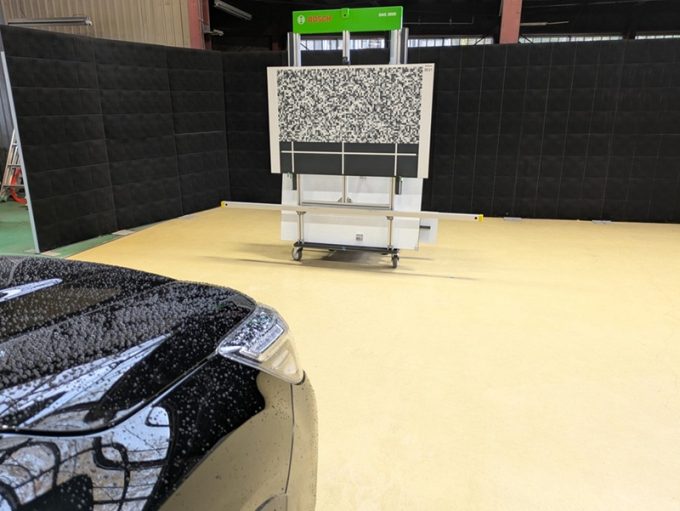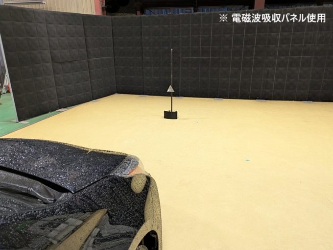 ※上記、「ミリ波レーダー」エーミングの際には反射物の無い空間が必要ですが、三角リフレクター後方の黒い壁に見える「電磁波吸収パネル」(ニフコ社製)を設置して不要な反射を防止し『検査空間』の確保を実施しています。