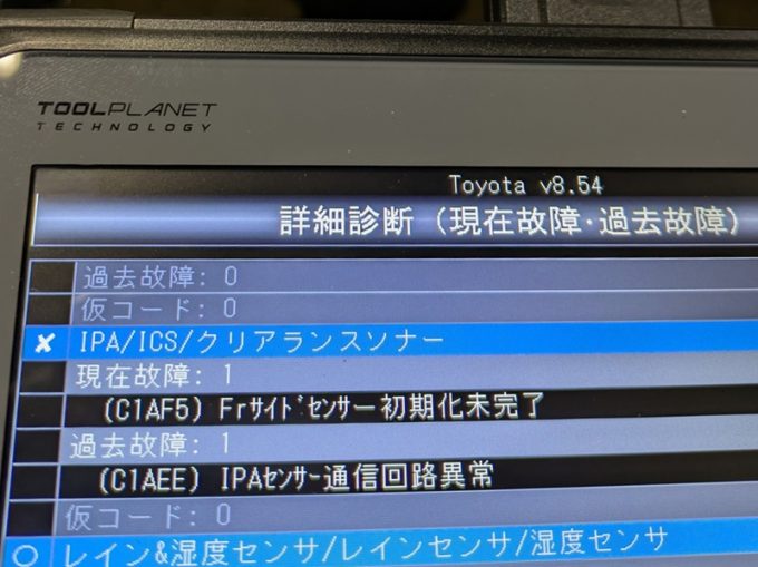 ※ 「フロントまわり修理をして、バンパーを交換したら警告灯が点いたので見て欲しい」と入電。 ソナー交換はしていない。