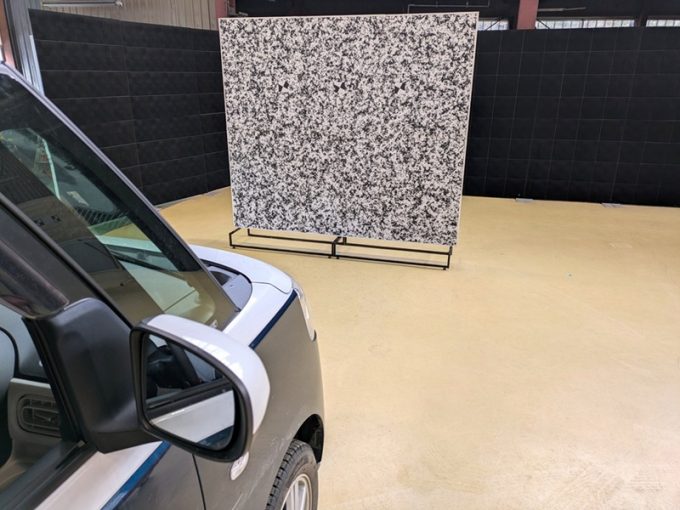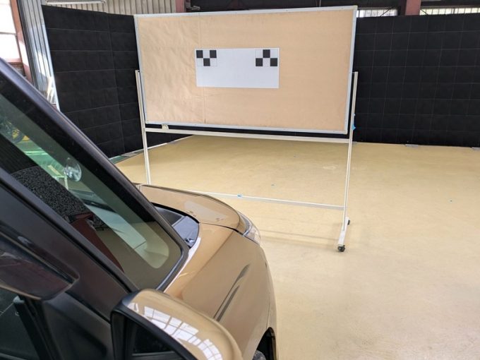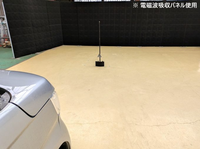 ※上記、「ミリ波レーダー」エーミングの際には反射物の無い空間が必要ですが、三角リフレクター後方の黒い壁に見える「電磁波吸収パネル」(ニフコ社製)を設置して不要な反射を防止し『検査空間』の確保を実施しています。