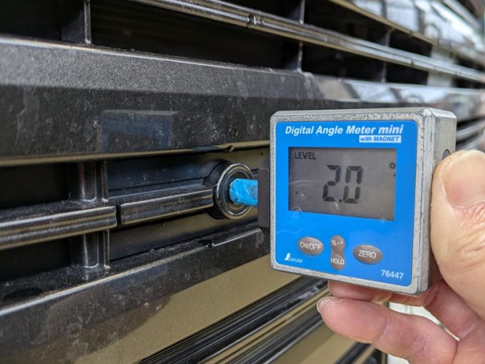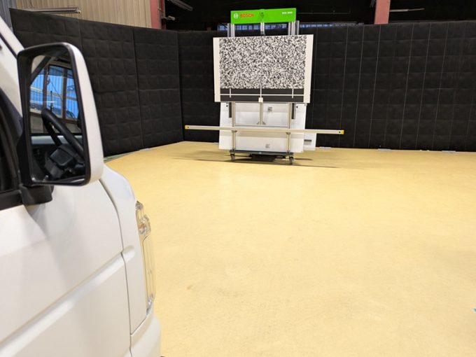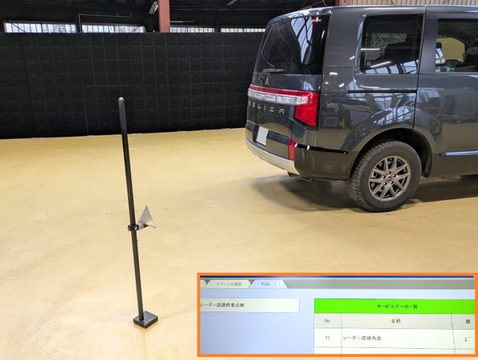 ※上記、「ミリ波レーダー」エーミングの際には反射物の無い空間が必要ですが、三角リフレクター後方の黒い壁に見える「電磁波吸収パネル」(ニフコ社製)を設置して不要な反射を防止し『検査空間』の確保を実施しています。