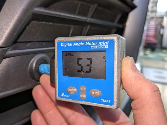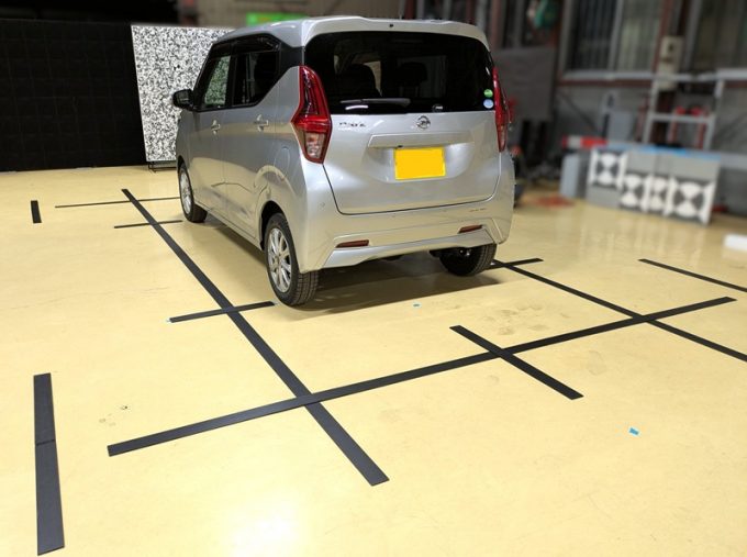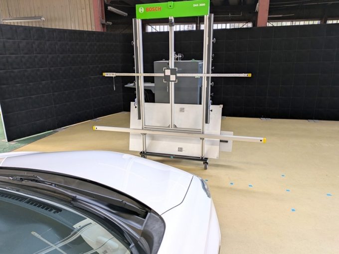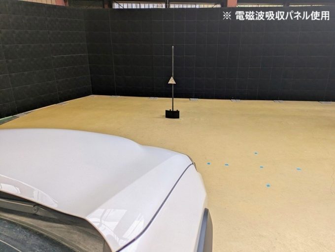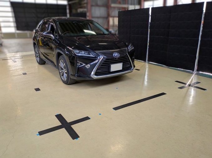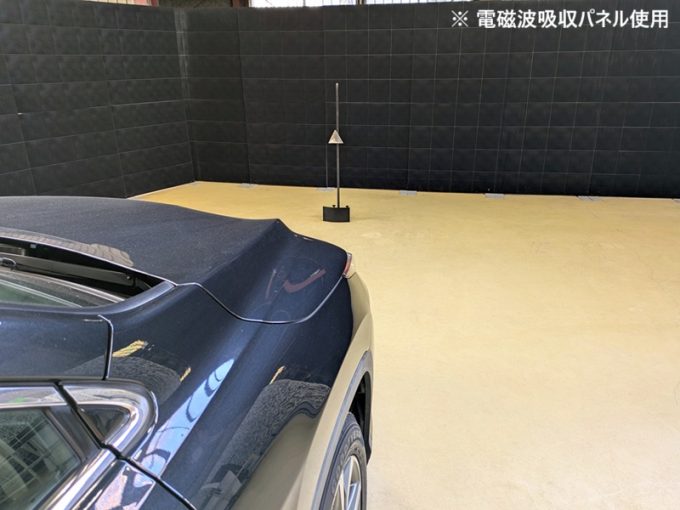 上記、「ミリ波レーダー」エーミングの際には反射物の無い空間が必要ですが、三角リフレクター後方の黒い壁に見える「電磁波吸収パネル」(ニフコ社製)を設置して不要な反射を防止し『検査空間』の確保を実施しています。