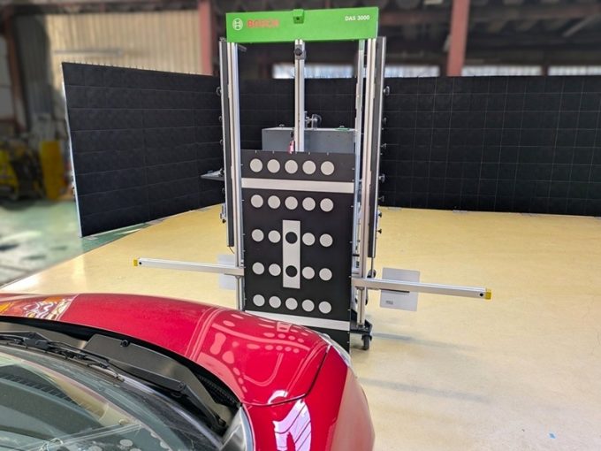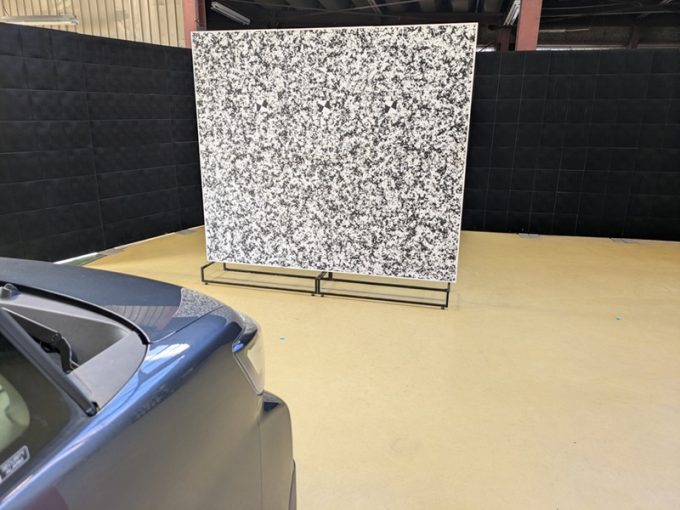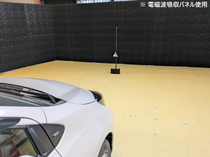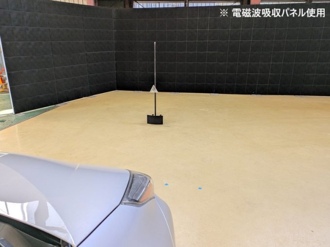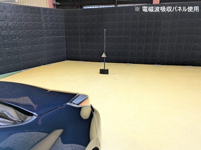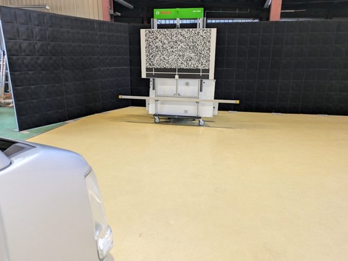 上記、「ミリ波レーダー」エーミングの際には反射物の無い空間が必要ですが、三角リフレクター後方の黒い壁に見える「電磁波吸収パネル」(ニフコ社製)を設置して不要な反射を防止し『検査空間』の確保を実施しています。