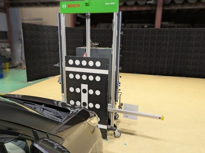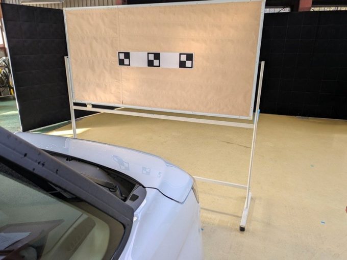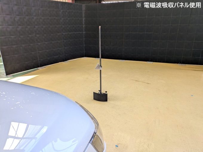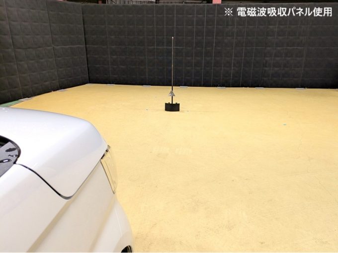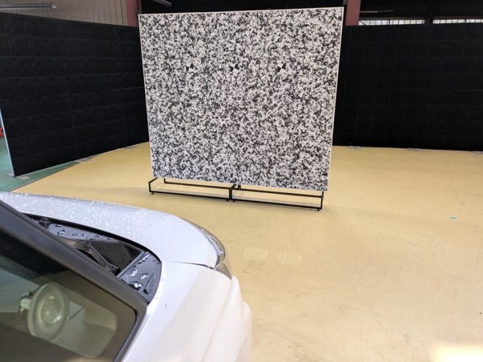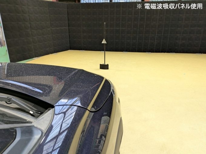 ※上記、「ミリ波レーダー」エーミングの際には反射物の無い空間が必要ですが、三角リフレクター後方の黒い壁に見える「電磁波吸収パネル」(ニフコ社製)を設置して不要な反射を防止し『検査空間』の確保を実施しています。