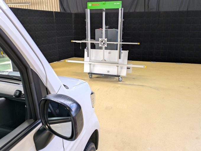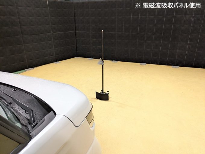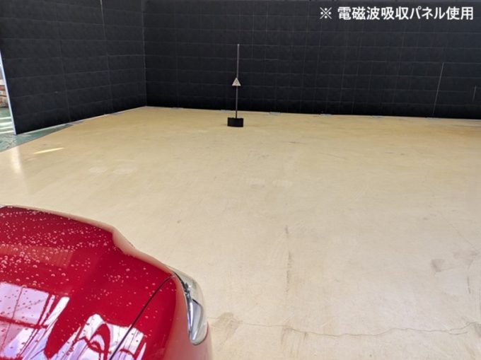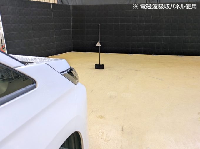 ※上記、「ミリ波レーダー」エーミングの際には反射物の無い空間が必要ですが、三角リフレクター後方の黒い壁に見える「電磁波吸収パネル」(ニフコ社製)を設置して不要な反射を防止し『検査空間』の確保を実施しています。