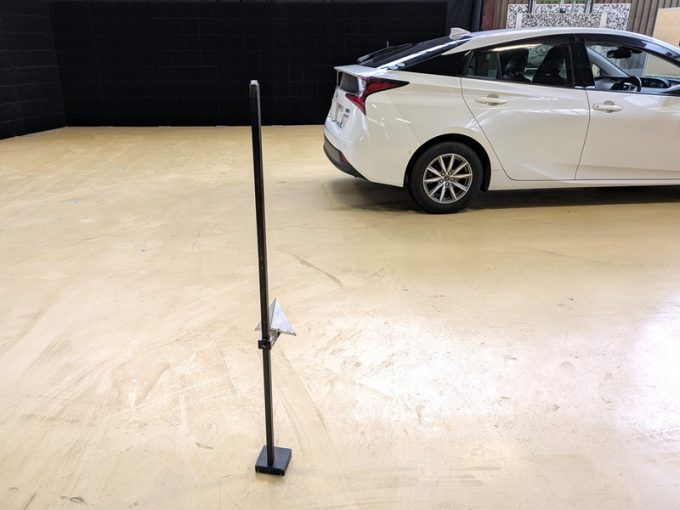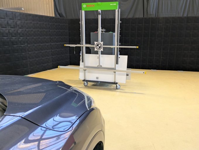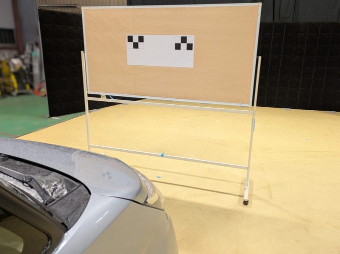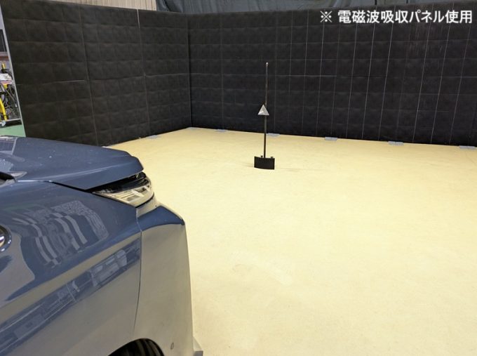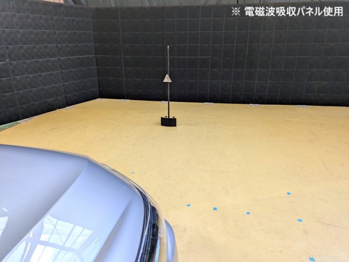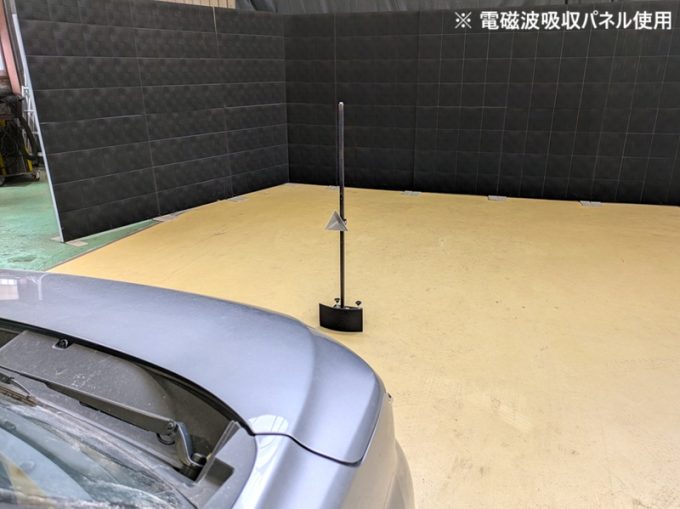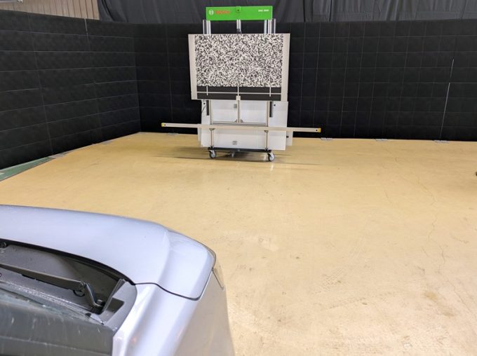 上記、「ミリ波レーダー」エーミングの際には反射物の無い空間が必要ですが、三角リフレクター後方の黒い壁に見える「電磁波吸収パネル」(ニフコ社製)を設置して不要な反射を防止し『検査空間』の確保を実施しています。