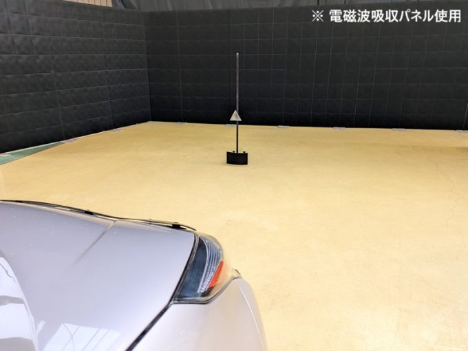 ※上記、「ミリ波レーダー」エーミングの際には反射物の無い空間が必要ですが、三角リフレクター後方の黒い壁に見える「電磁波吸収パネル」(ニフコ社製)を設置して不要な反射を防止し『検査空間』の確保を実施しています。