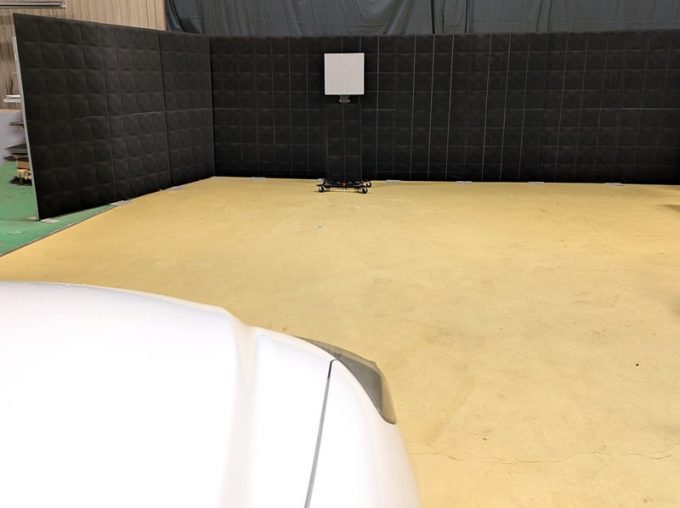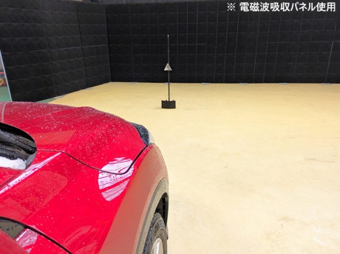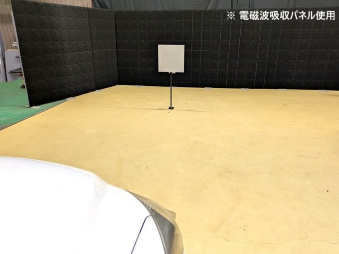 ※上記、「ミリ波レーダー」エーミングの際には反射物の無い空間が必要ですが、三角リフレクター後方の黒い壁に見える「電磁波吸収パネル」(ニフコ社製)を設置して不要な反射を防止し『検査空間』の確保を実施しています。