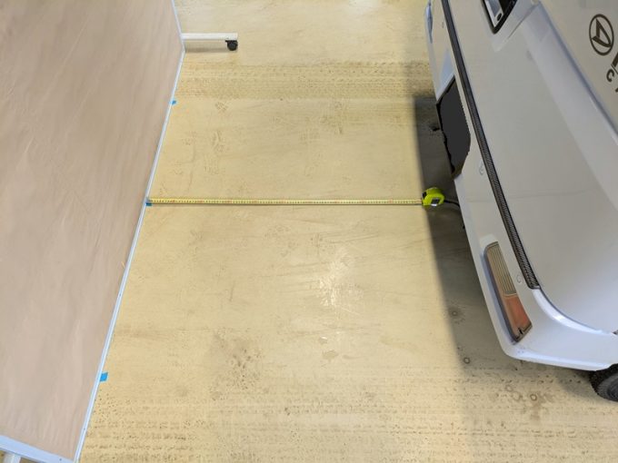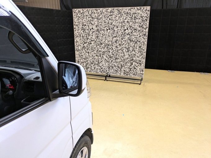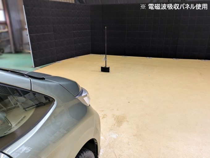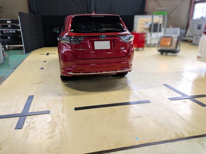 上記、「ミリ波レーダー」エーミングの際には反射物の無い空間が必要ですが、三角リフレクター後方の黒い壁に見える「電磁波吸収パネル」(ニフコ社製)を設置して不要な反射を防止し『検査空間』の確保を実施しています。