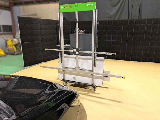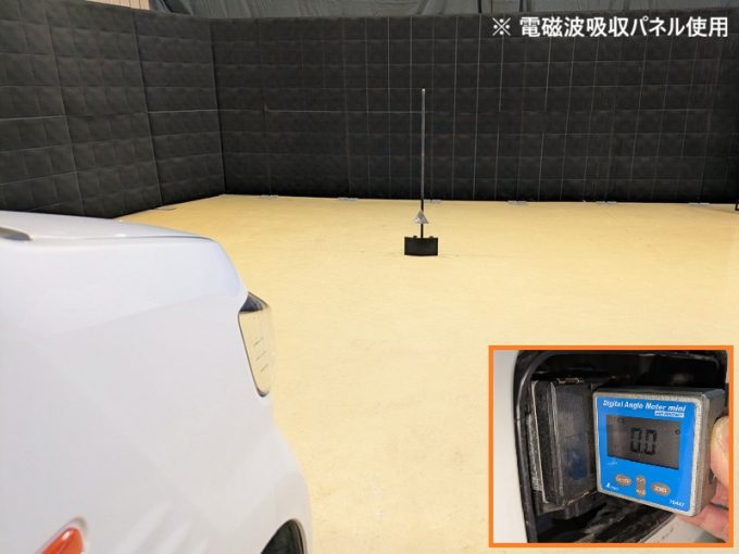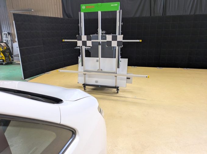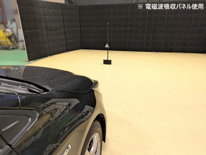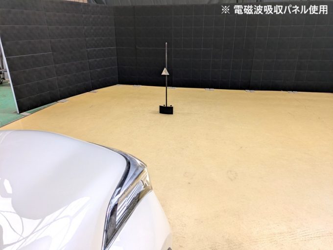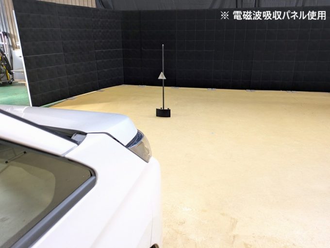 ※上記、「ミリ波レーダー」エーミングの際には反射物の無い空間が必要ですが、三角リフレクター後方の黒い壁に見える「電磁波吸収パネル」(ニフコ社製)を設置して不要な反射を防止し『検査空間』の確保を実施しています。
