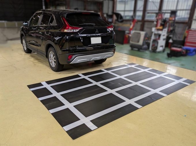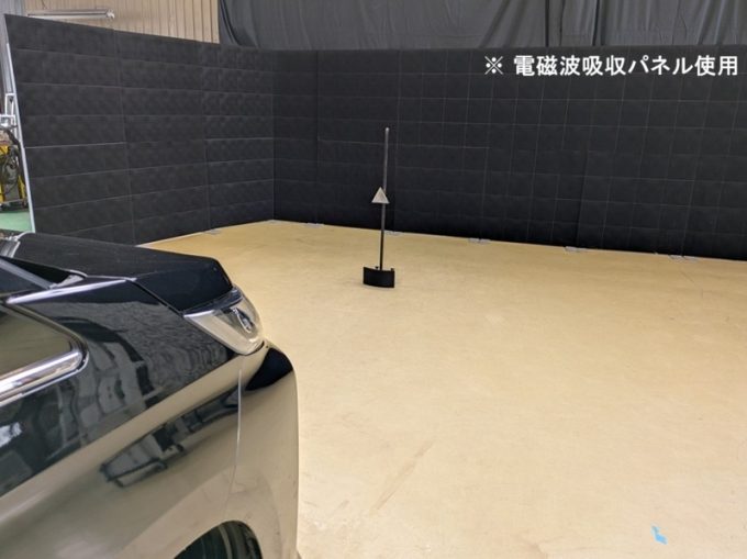※ 上記、「ミリ波レーダー」エーミングの際には反射物の無い空間が必要ですが、三角リフレクター後方の黒い壁に見える「電磁波吸収パネル」(ニフコ社製)を設置して不要な反射を防止し『検査空間』の確保を実施しています。