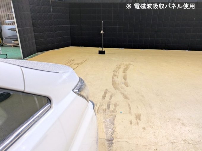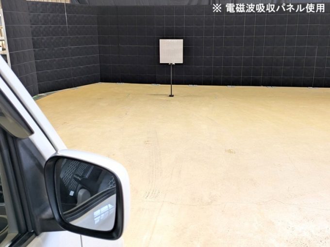 ※ 上記、「ミリ波レーダー」 エーミングの際には反射物の無い空間が必要ですが、三角リフレクター後方の黒い壁に見える「電磁波吸収パネル」(ニフコ社製)を設置して不要な反射を防止し『検査空間』の確保を実施しています。