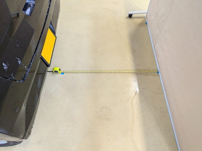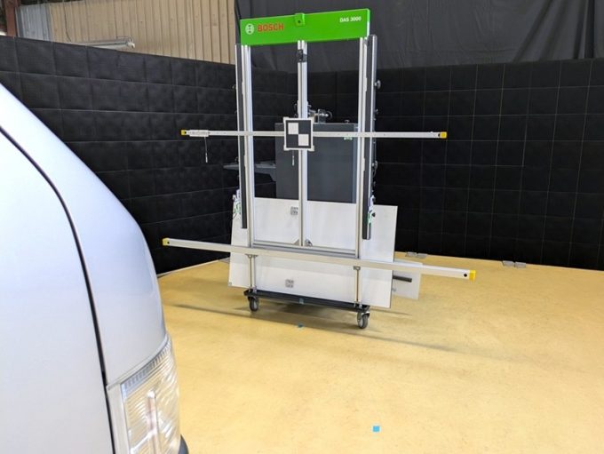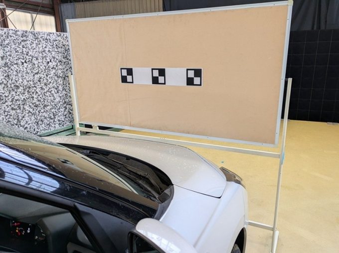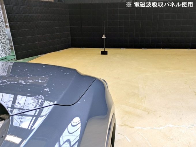 ※ 上記、「ミリ波レーダー」 エーミングの際には反射物の無い空間が必要ですが、三角リフレクター後方の黒い壁に見える「電磁波吸収パネル」(ニフコ社製)を設置して不要な反射を防止し『検査空間』の確保を実施しています。