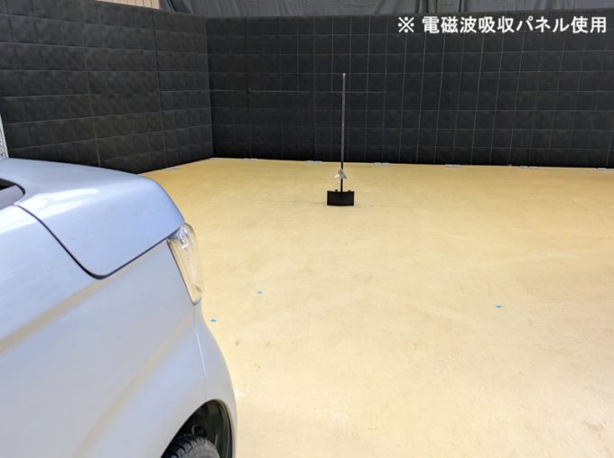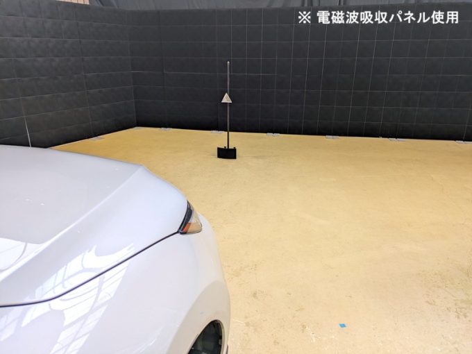 ※ 上記、「ミリ波レーダー」 エーミングの際には反射物の無い空間が必要ですが、三角リフレクター後方の黒い壁に見える「電磁波吸収パネル」(ニフコ社製)を設置して不要な反射を防止し『検査空間』の確保を実施しています。