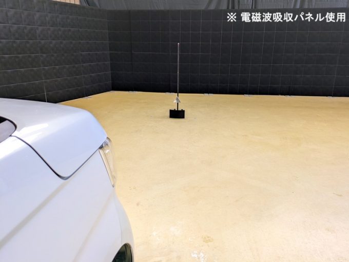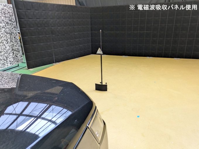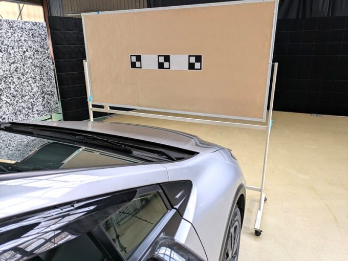 ・上記、「ミリ波レーダー」 エーミングの際には反射物の無い空間が必要ですが、三角リフレクター後方の黒い壁に見える「電磁波吸収パネル」(ニフコ社製)を設置して不要な反射を防止し『検査空間』の確保を実施しています。