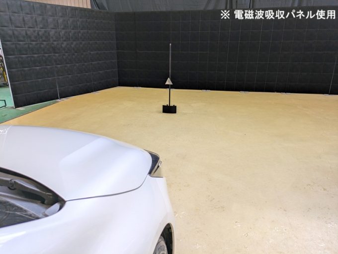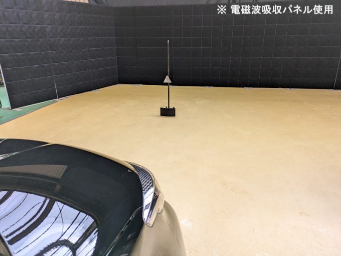 ◆ 上記、「ミリ波レーダー」 エーミングの際には反射物の無い空間が必要ですが、三角リフレクター後方の黒い壁に見える「電磁波吸収パネル」(ニフコ社製)を設置して不要な反射を防止し『検査空間』の確保を実施しています。