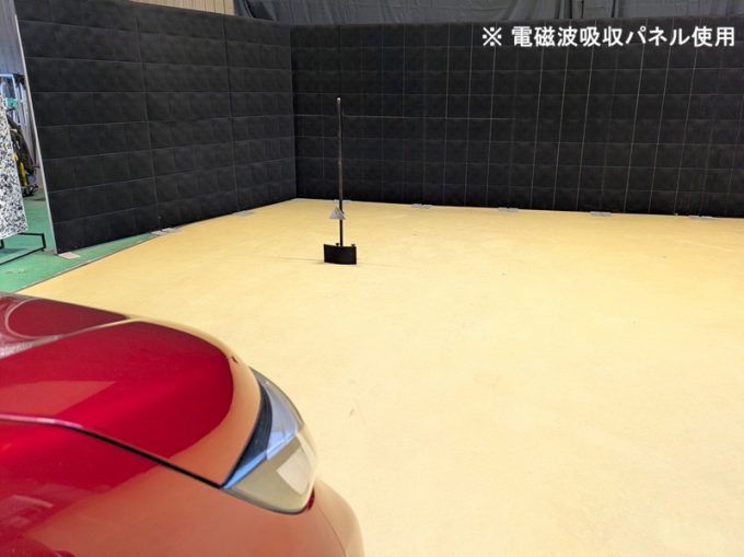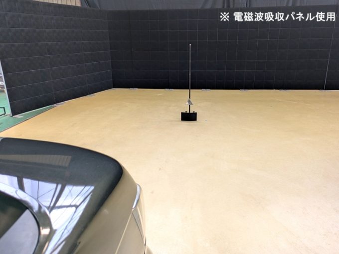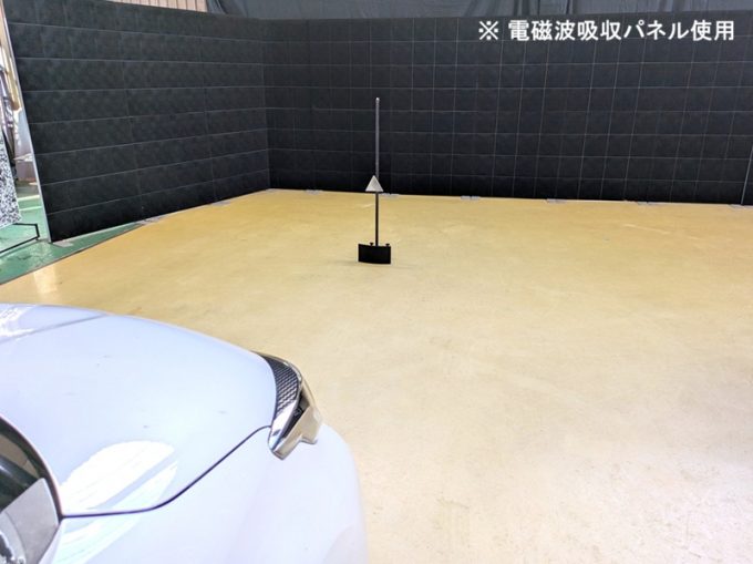 ◆ 上記、「ミリ波レーダー」 エーミングの際には反射物の無い空間が必要ですが、三角リフレクター後方の黒い壁に見える「電磁波吸収パネル」(ニフコ社製)を設置して不要な反射を防止し『検査空間』の確保を実施しています。
