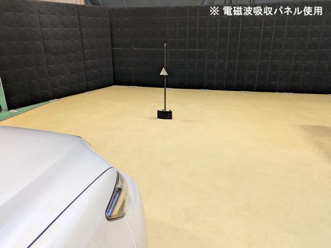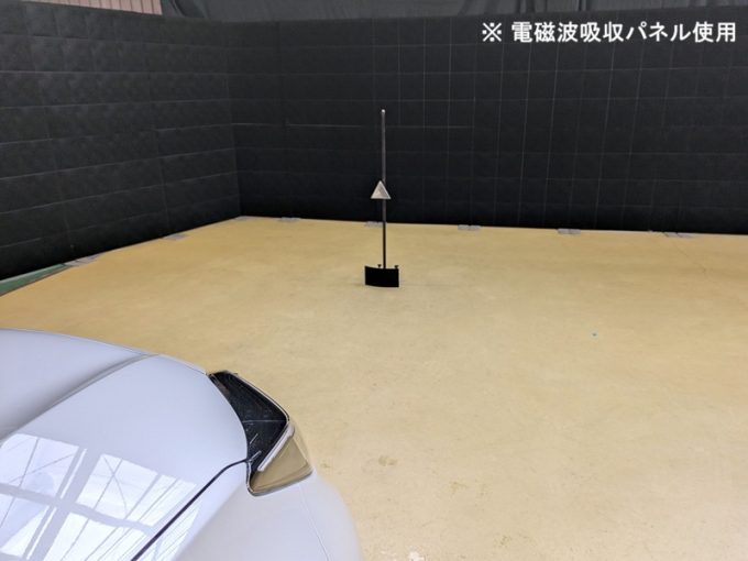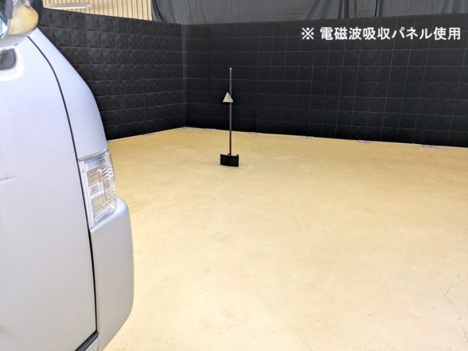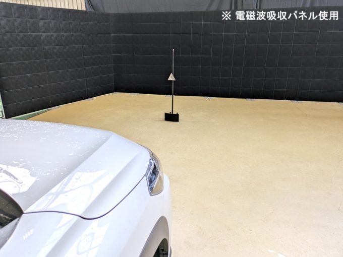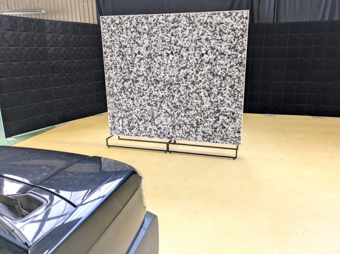 ※ 上記、「ミリ波レーダー」 エーミングの際には反射物の無い空間が必要ですが、三角リフレクター後方の黒い壁に見える「電磁波吸収パネル」(ニフコ社製)を設置して不要な反射を防止し『検査空間』の確保を実施しています。