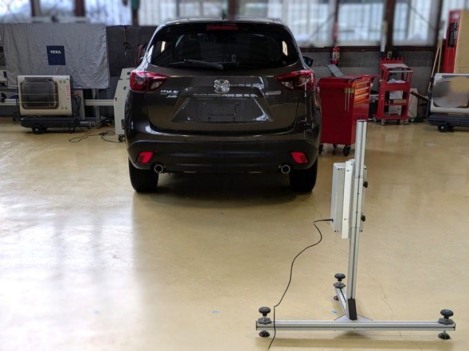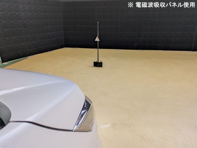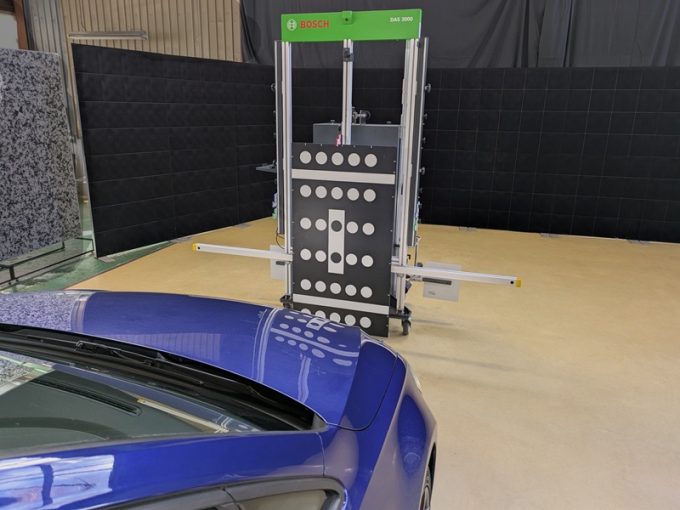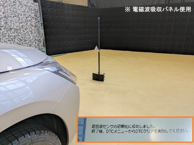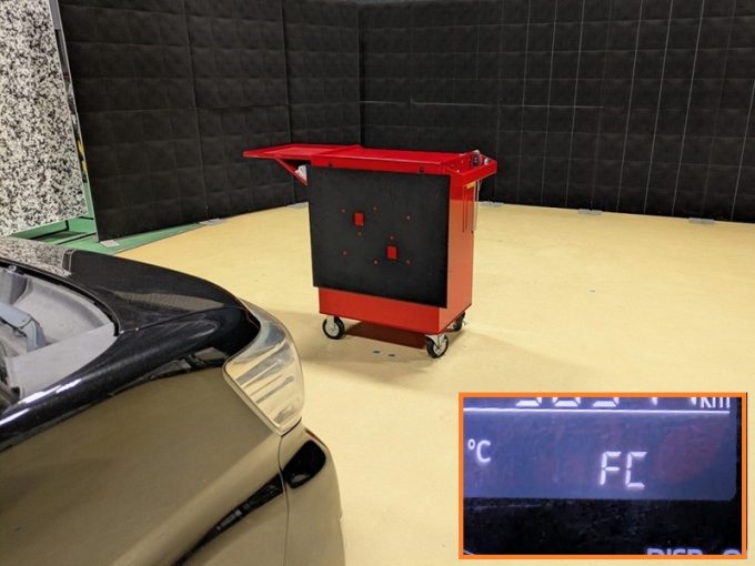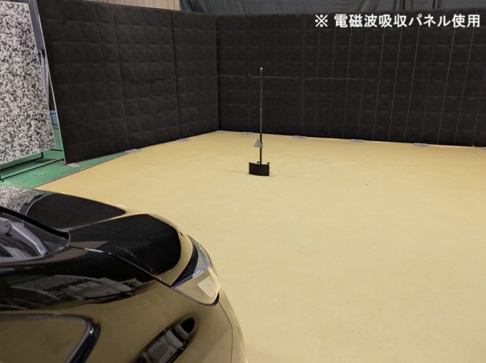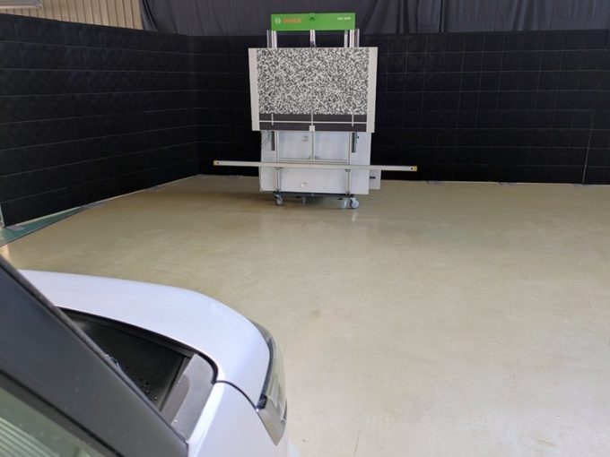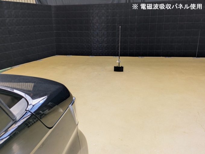 ・上記、「ミリ波レーダー」 エーミングの際には反射物の無い空間が必要ですが、三角リフレクター後方の黒い壁に見える「電磁波吸収パネル」(ニフコ社製)を設置して不要な反射を防止し『検査空間』の確保を実施しています。