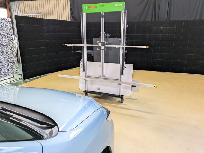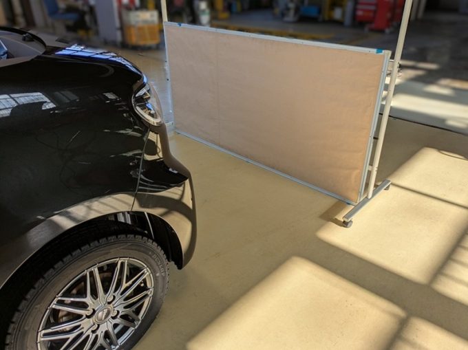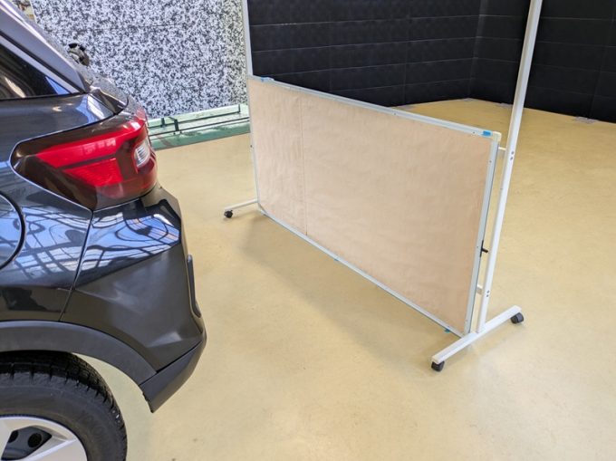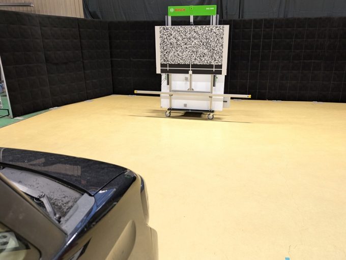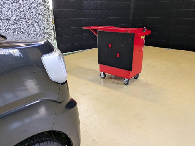 ◇ 上記、「ミリ波レーダー」 エーミングの際には反射物の無い空間が必要ですが、三角リフレクター後方の黒い壁に見える「電磁波吸収パネル」(ニフコ社製)を設置して不要な反射を防止し『検査空間』の確保を実施しています。