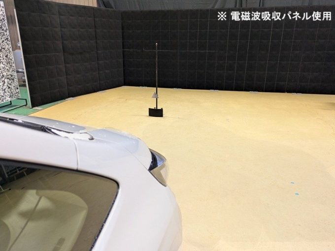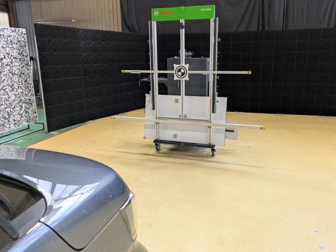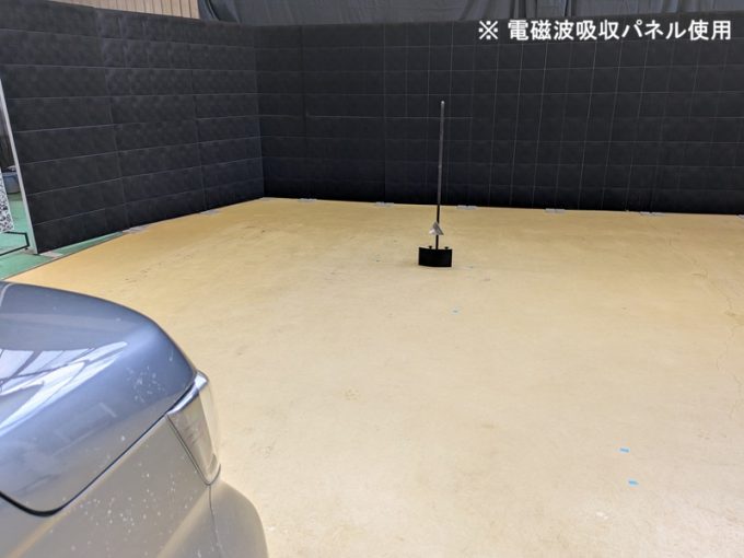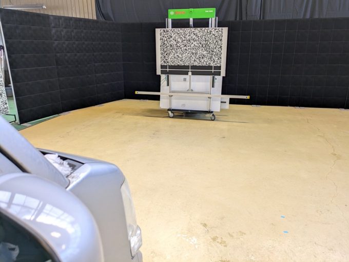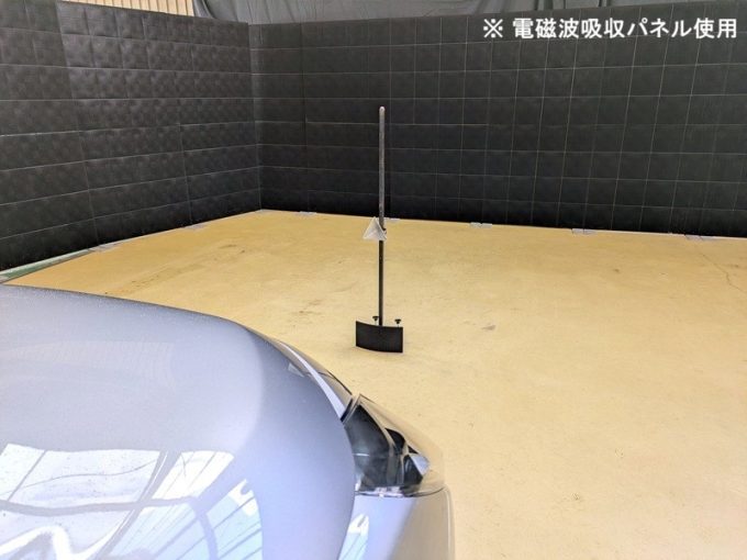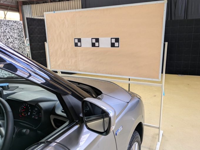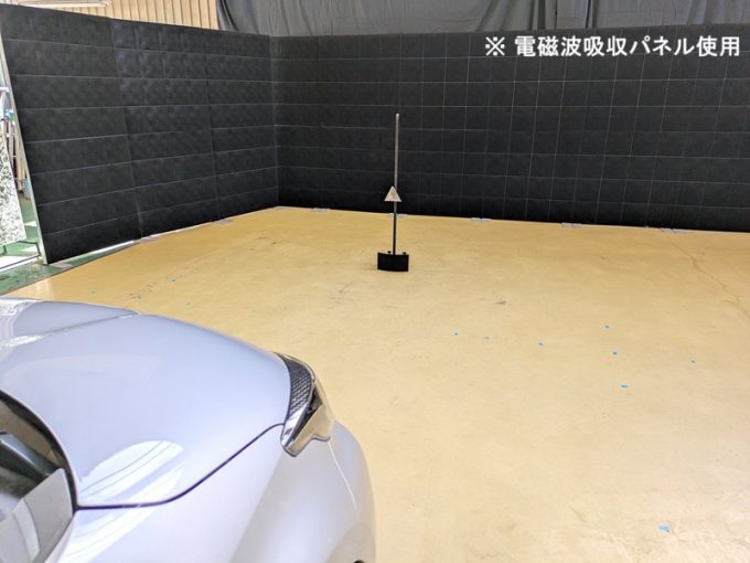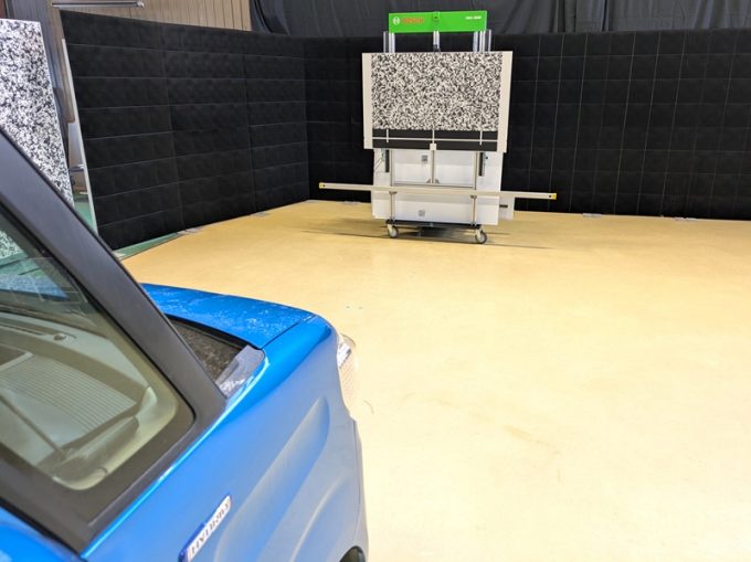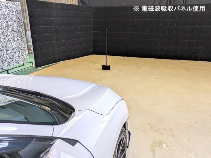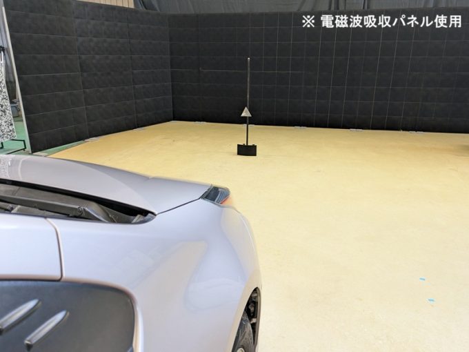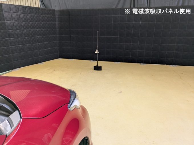 ◇ 上記、「ミリ波レーダー」 エーミングの際には反射物の無い空間が必要ですが、三角リフレクター後方の黒い壁に見える「電磁波吸収パネル」(ニフコ社製)を設置して不要な反射を防止し『検査空間』の確保を実施しています。