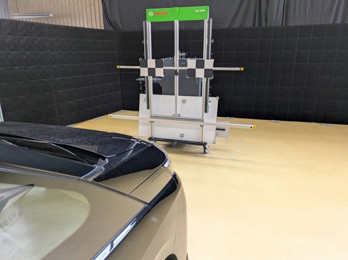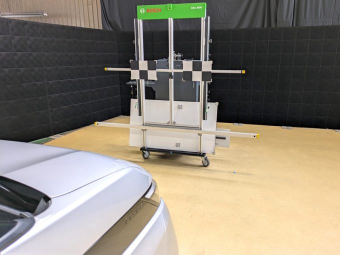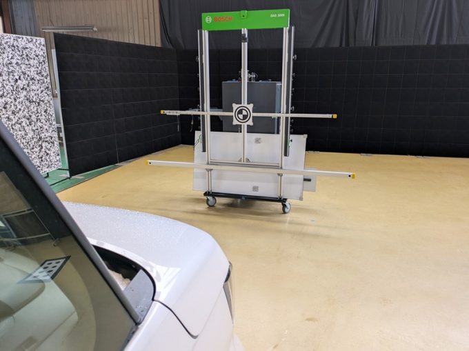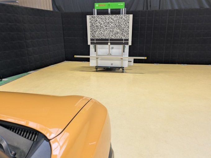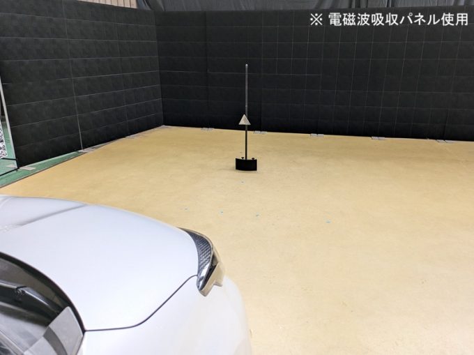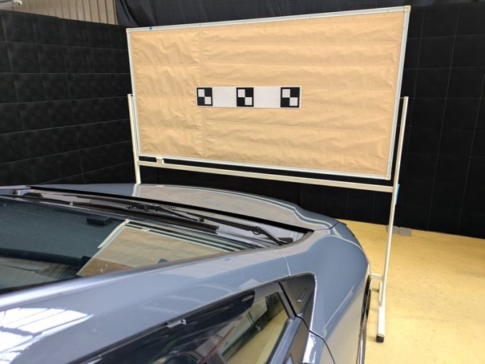◆ 上記、 「ミリ波レーダー」 エーミングの際には反射物の無い空間が必要ですが、三角リフレクター後方の黒い壁に見える「電磁波吸収パネル」(ニフコ社製)を設置して不要な反射を防止し『検査空間』の確保を実施しています。