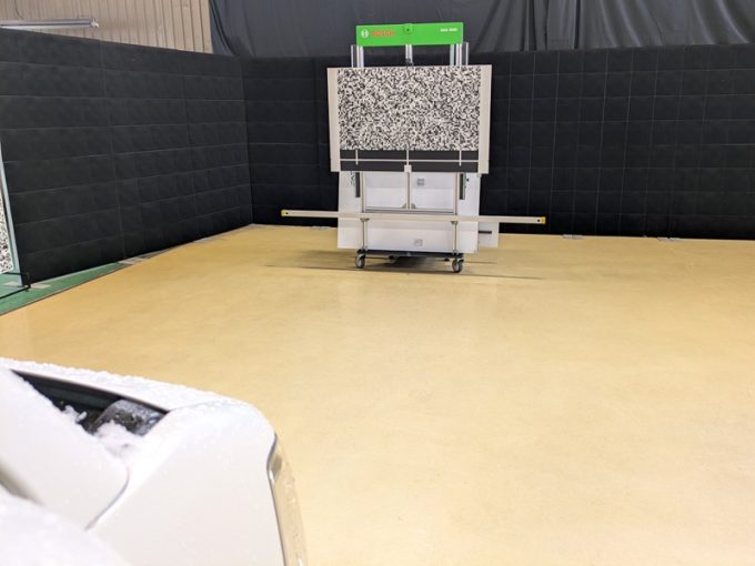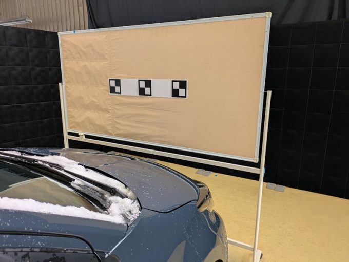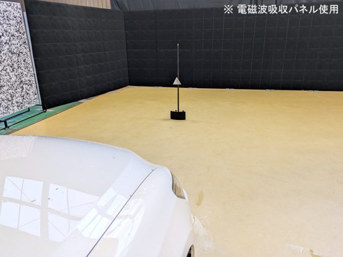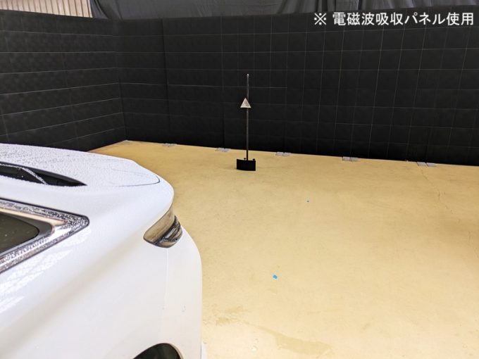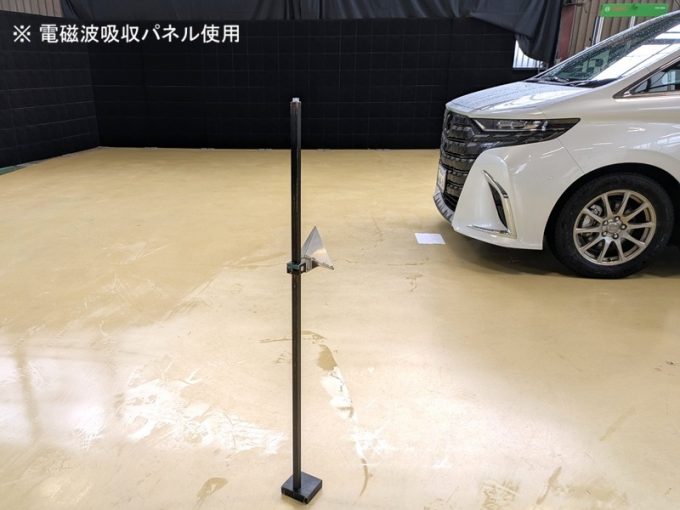 ◆ 上記、各車 「ミリ波レーダー」 エーミングの際には反射物の無い空間が必要ですが、三角リフレクター後方の黒い壁に見える「電磁波吸収パネル」(ニフコ社製)を設置して不要な反射を防止し『検査空間』の確保を実施しています。