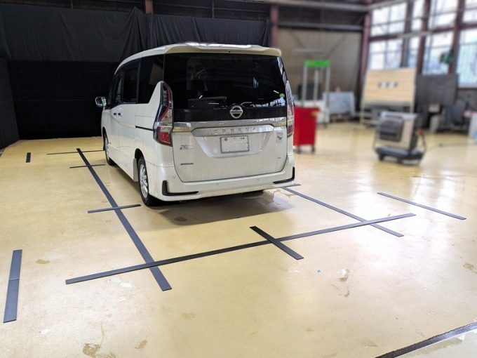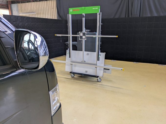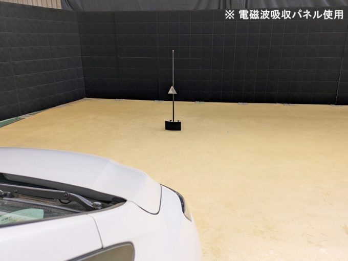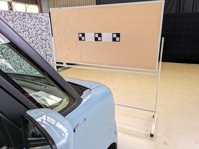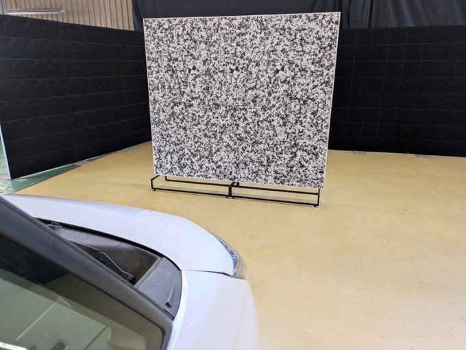 ◆ 上記、各車 「ミリ波レーダー」 エーミングの際には反射物の無い空間が必要ですが、三角リフレクター後方の黒い壁に見える「電磁波吸収パネル」(ニフコ社製)を設置して不要な反射を防止し『検査空間』の確保を実施しています。