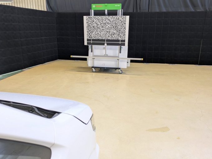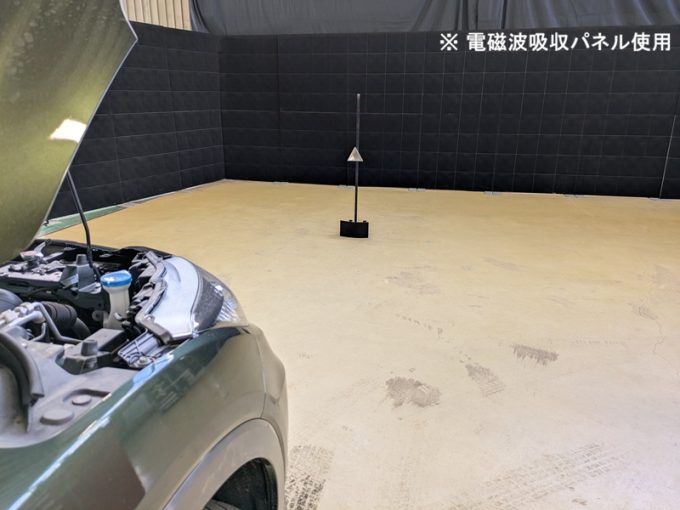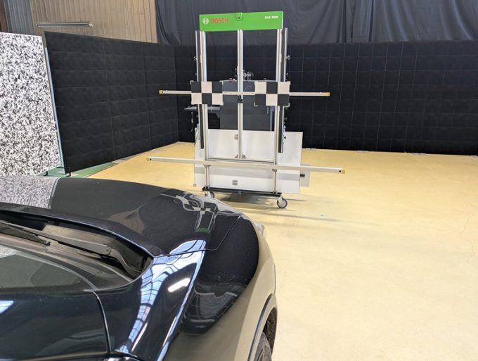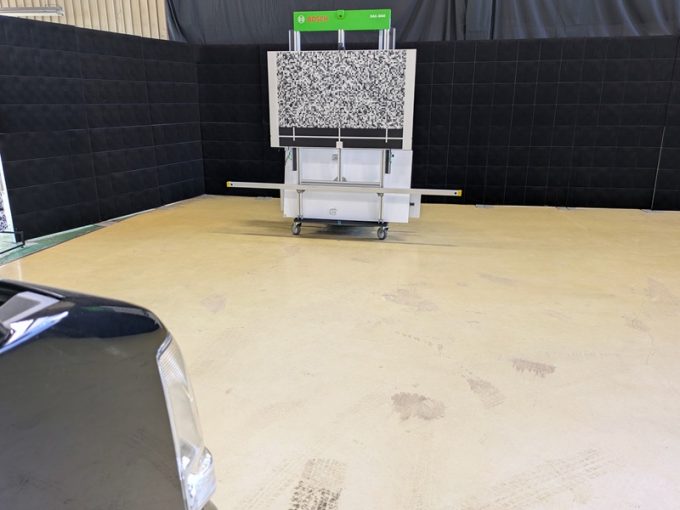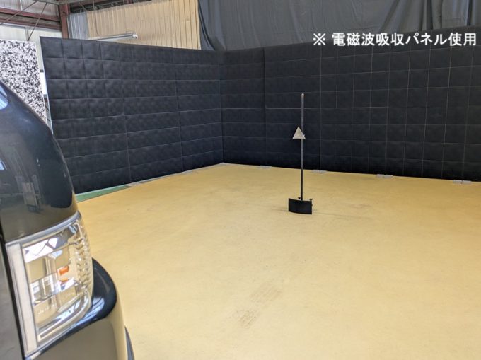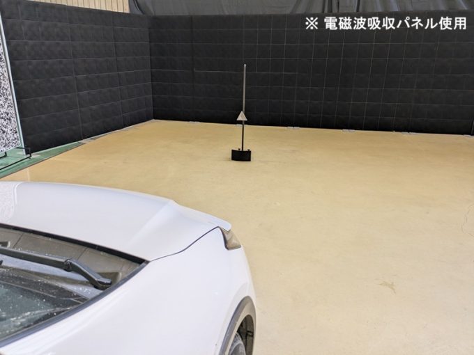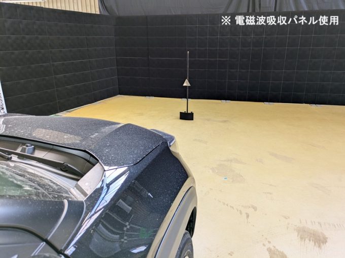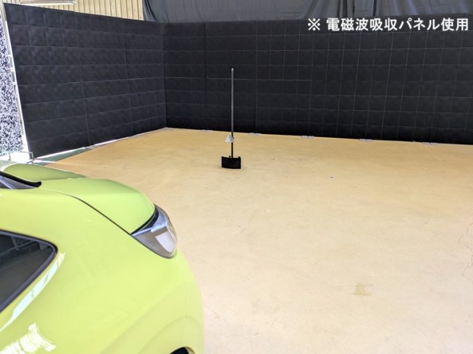 ◆ 上記、各車 「ミリ波レーダー」 エーミングの際には反射物の無い空間が必要ですが、三角リフレクター後方の黒い壁に見える「電磁波吸収パネル」(ニフコ社製)を設置して不要な反射を防止し『検査空間』の確保を実施しています。