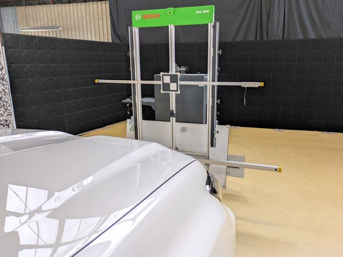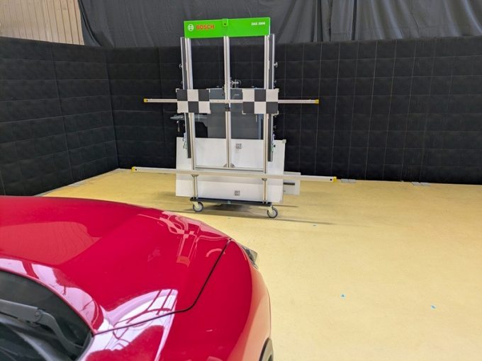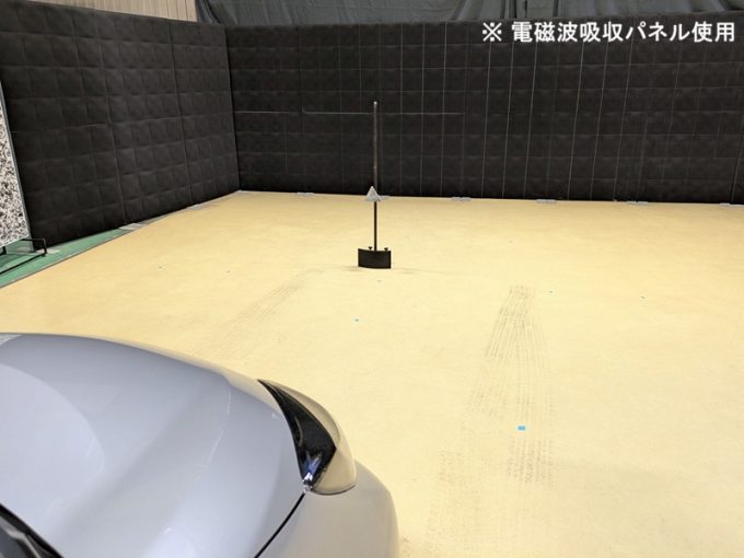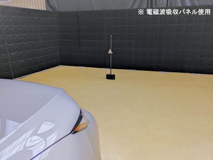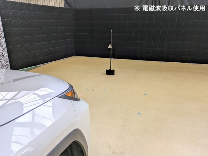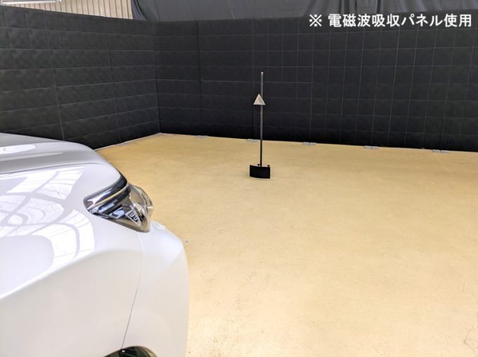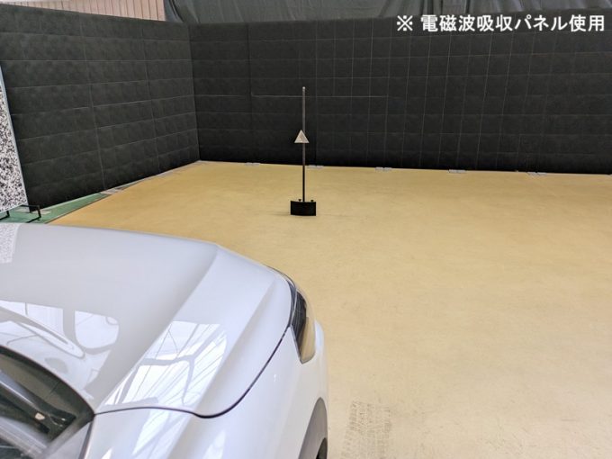 ◆ 上記、各車 「ミリ波レーダー」 エーミングの際には反射物の無い空間が必要ですが、三角リフレクター後方の黒い壁に見える「電磁波吸収パネル」(ニフコ社製)を設置して不要な反射を防止し『検査空間』の確保を実施しています。